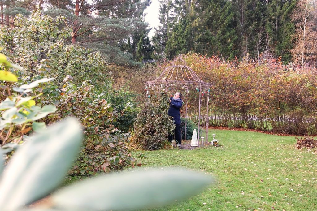 Kuva: Salon tunnelmakatosta kehystävät jalokärhököynnökset, joissa on kukintoja jäljellä vielä lokakuussa.